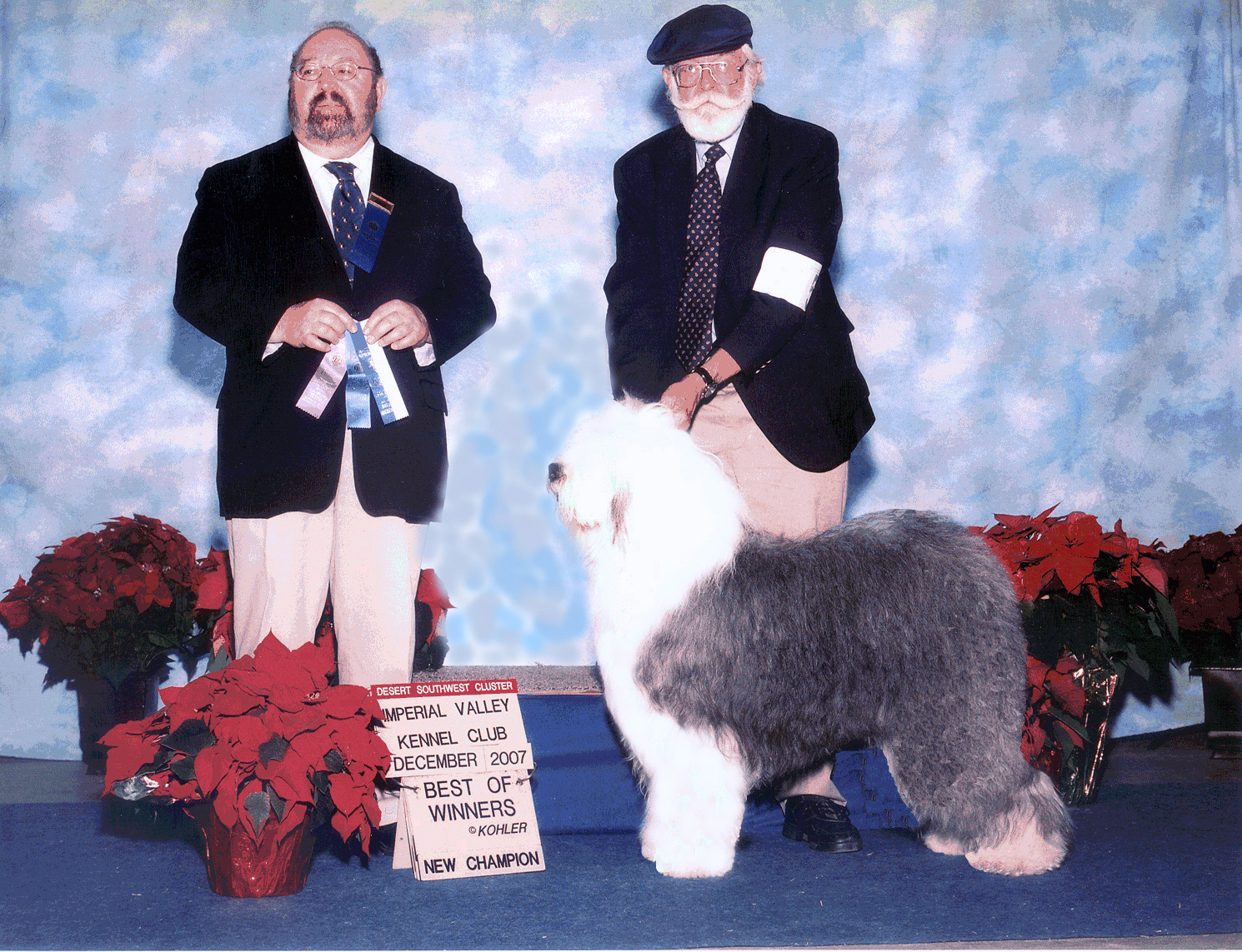 Champion Mapleridge On Q at Post Road (aka "Cue Ball") Our current Old English Sheepdog. We did not breed this dog ourselves but he is a direct descendant of our dogs. He was bred by a friend who started her breeding program with our dogs Shown here as a young dog winning Best of Winners in Yuma, Arizona, to earn his final points for his AKC Championship. |